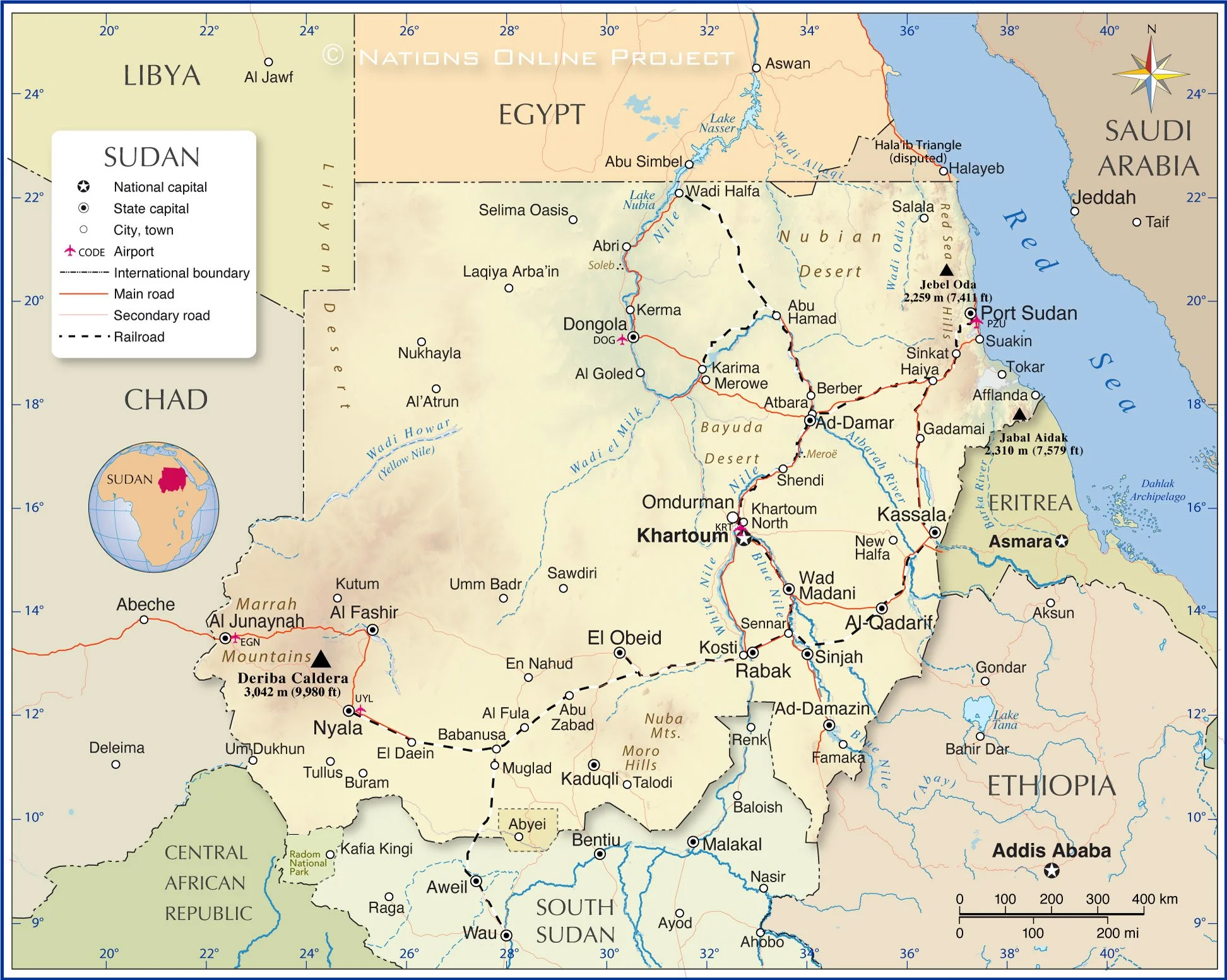The map shows Sudan and surrounding countries with international borders, the national capital Khartoum, state capitals, major cities, main roads, railroads, and major airports.