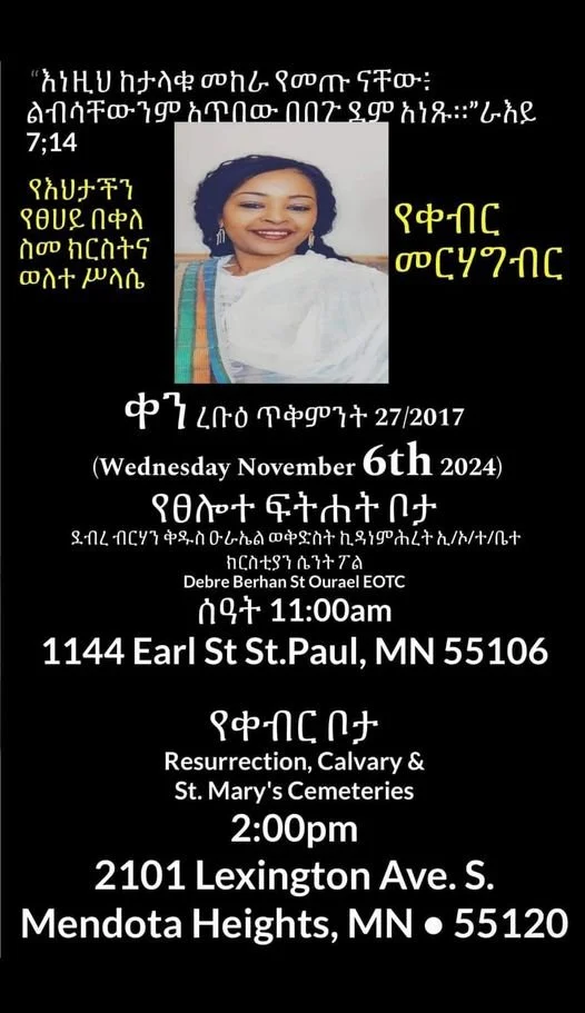 Our SisterTsehai Bekele’s Fnueral Procession at Debre Berhan St. Ourael EOTC Nov 4 Written By Daniel Gobeze Debre Berhan St. Ourael EOTC Daniel Gobeze